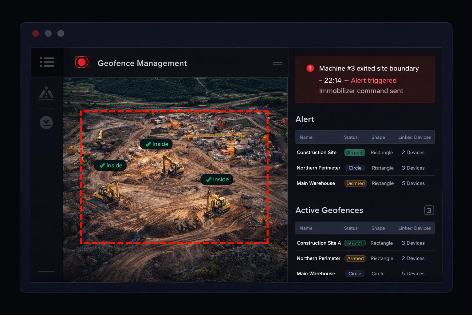 Zeichnen Sie virtuelle Grenzen um jede Baustelle. Verlässt eine Maschine den Perimeter außerhalb der Arbeitszeiten, erhalten Sie sofort einen Alarm — optional mit automatischem Wegfahrsperrenbefehl. Diebstahlschutz-Geofences gehen noch weiter und lösen eine Fernsperrung ohne manuellen Eingriff aus.
