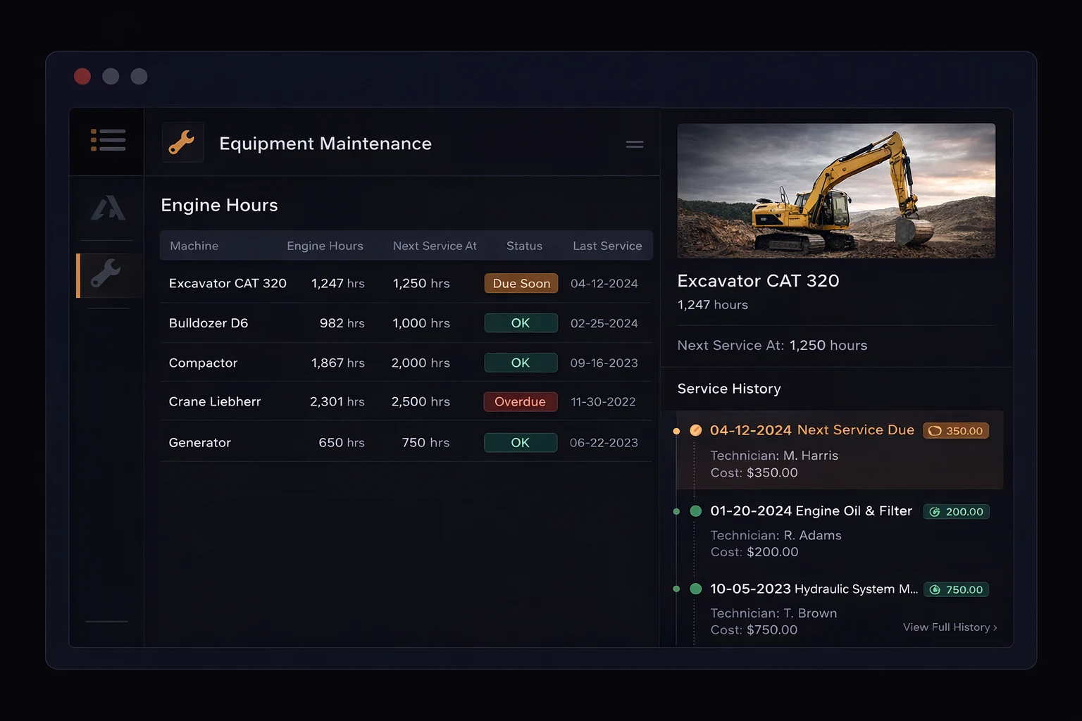 FlottaGPS erfasst Motorstunden über CAN-Bus oder AVL-Telematik und liefert Ihnen einen präzisen Laufzeitzähler pro Maschine. Wartung kann nach Motorstunden geplant werden (z. B. Service alle 250 Stunden), und das System markiert überfällige Punkte automatisch und sendet Erinnerungen, bevor kritische Intervalle verpasst werden.