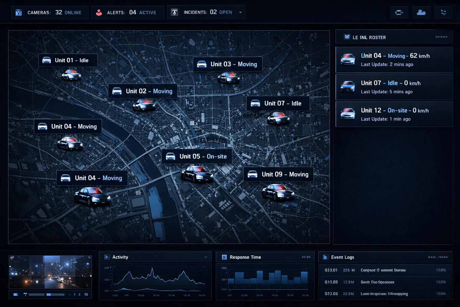 Ihr Einsatzleitstand erhält eine Live-Karte jedes Patrouillenfahrzeugs mit Positionsupdates im Sekundentakt. Einheitenstatus — in Bewegung, Leerlauf, gestoppt — ist auf einen Blick sichtbar. Weisen Sie die nächstgelegene Einheit jedem Vorfall ohne Funkanrufe zu und verfolgen Sie die Reaktion in Echtzeit.