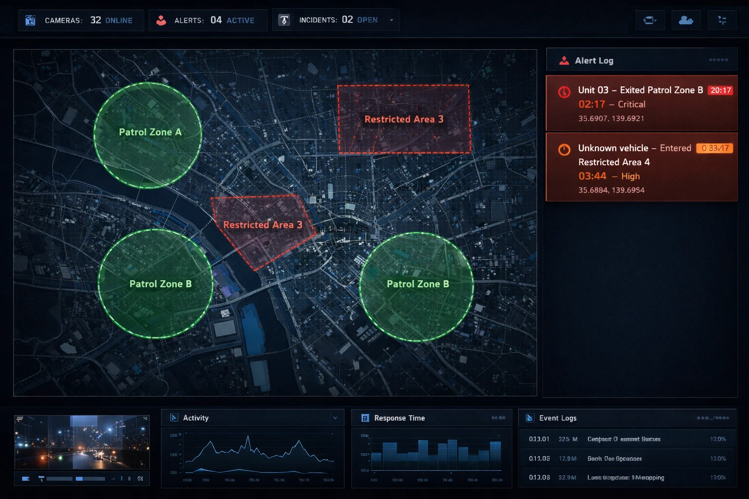 - Geofence-Zonen für Patrouillenbereiche und Kundenstandorte
