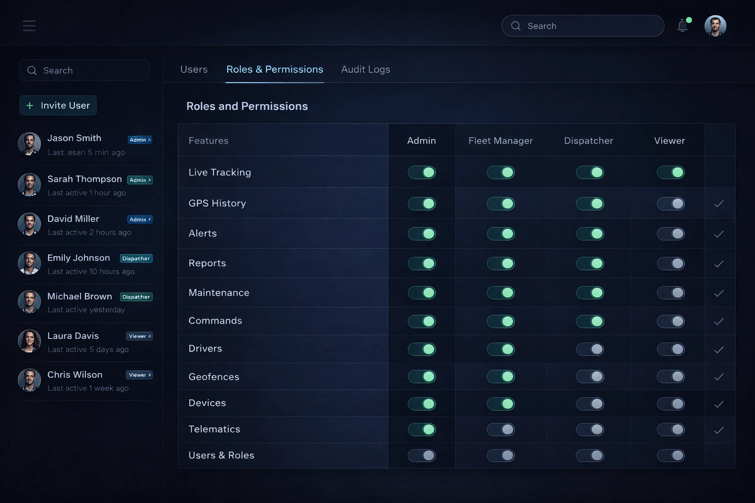 Create fully custom roles with any combination of view, create, edit, delete, and control permissions — per feature, per module. Assign device visibility per user so each operator or department only sees their assigned vehicles. Scale from 5 to 500 users without compromising security.