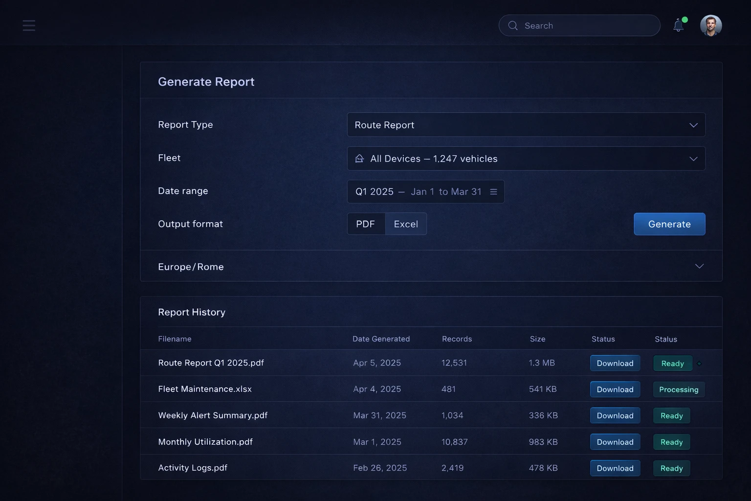 Go beyond GPS with full IO telemetry, configurable CAN bus templates, and a raw packet viewer. Generate reports for any date range asynchronously — daily, weekly, monthly, or custom — with stored artifacts you can re-download at any time. Every report includes timezone-aware generation for international teams.