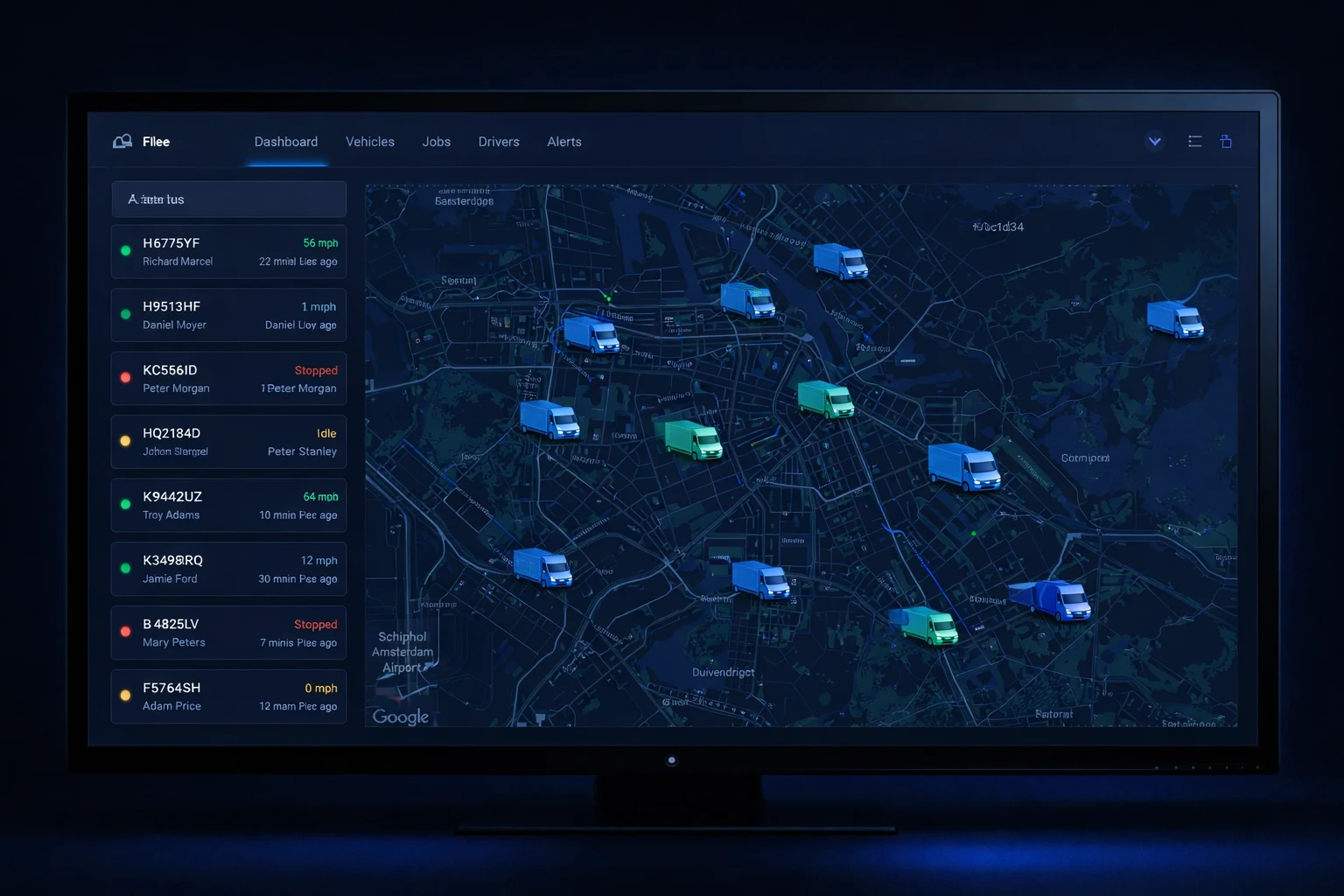 - Color-coded vehicle statuses: moving, idle, stopped, offline
