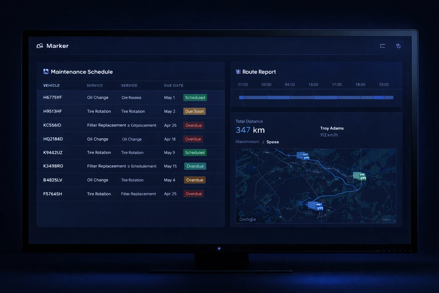 Schedule maintenance by kilometers, time intervals, or engine hours. FlottaGPS flags overdue items, sends reminders, and logs completed services automatically. Pair that with detailed route reports and driver assignment logs for full operational transparency.