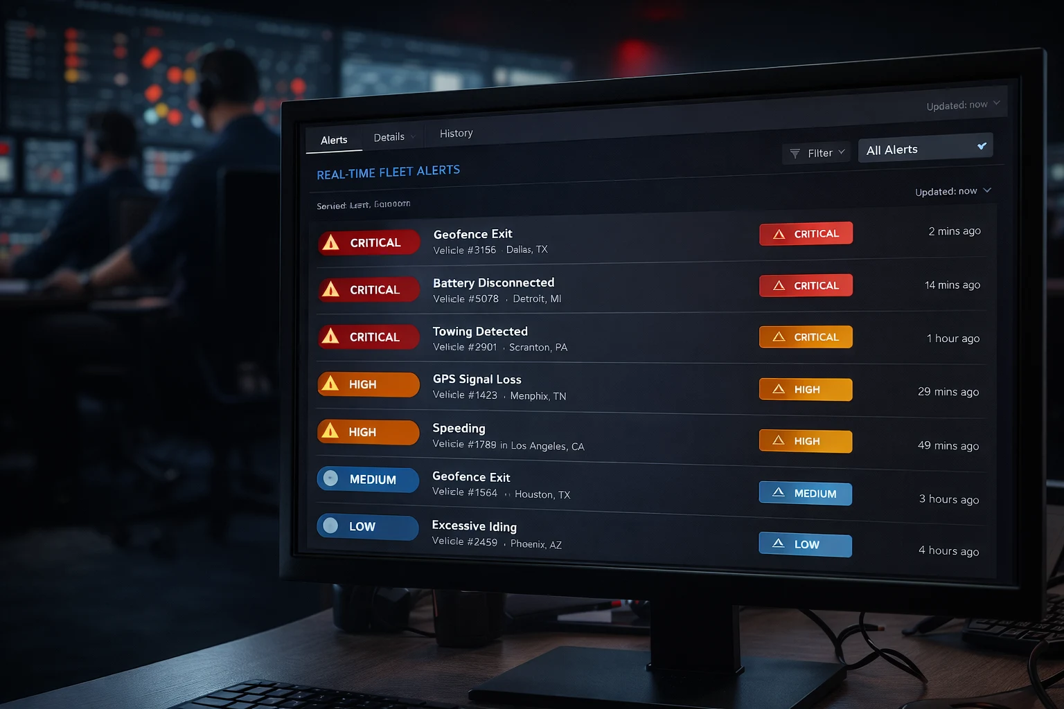 FlottaGPS supervisa ocho tipos de alertas en toda tu flota — desde violaciones de geocercas y desconexiones de bateria hasta deteccion de remolque y alertas de choque — cada una con un nivel de gravedad para que tu equipo sepa que priorizar.