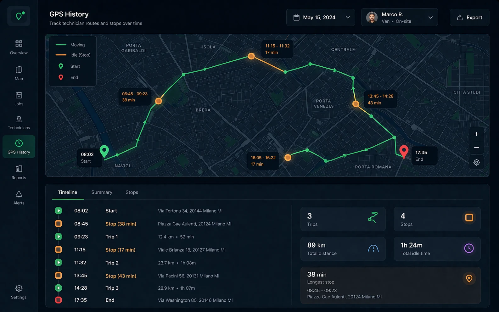 Ogni visita al sito cliente viene registrata con un timestamp GPS — indirizzo esatto, orario di arrivo e partenza. Usa la riproduzione del percorso per verificare le chiamate di assistenza. E mantieni la flotta efficiente con la pianificazione automatica della manutenzione attivata da distanza, tempo o ore motore.
