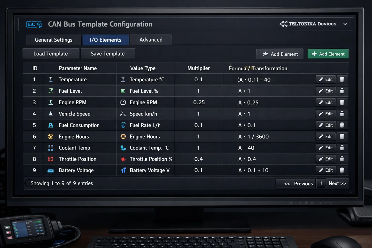 Manually configure CAN bus templates for your specific Teltonika device models — including FTC305 and TFT100. Each template supports 20+ configurable IO elements with value transformations: multiplier, offset, boolean mapping, and formula-based calculations.